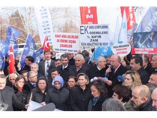 Yoğun katılımın olduğu eylemimizde bir konuşma yapan Türkiye Kamu-Sen Genel Başkanı İsmail Koncuk, “Görünen o ki, 2014 yılında da iktidar milletin sırtına binerek bütçeyi oluşturmayı planlamıştır” dedi. Koncuk, “TBMM’de görüşülen 2014 yılı bütçesi ağır bir mali disiplin bütçesi olarak hazırlanmış, bütçenin bütün yükü ücretli çalışanlar üzerine yüklenmiştir.