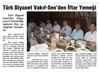 Sofra restoranda bir araya gelen sendika üyeleri, iftar öncesi kısa süre sohbet etti. İftar sonrası üyelere seslenen Türk Diyanet Vakıf Sen İl Temsilcisi Mehmet Sait DOĞAN, "Bilindiği gibi rahmet ve bereket ayı olan ramazan ayını idrak ediyoruz. Bu ayda; oruç, zekat, sadaka ibadetinin öne çıkması gerekiyor. Bu ayda, kişilerin birleştirici, kaynaştırıcı ve paylaşma ruhu öne çıkmaktadır. Paylaşma ruhunun olmadığı yerde huzur ve refahtan bahsetmek mümkün değildir. Toplumda arasında uçurumlar meydana gelir.Yoksulluk terör, anarşi ve bölünmeler olur.Bugün Afrika`da kıtanın bir yüzünde dünyanın en zenginleri çok lüks ve şatafatlı bir hayat sürerken, sınırın öbür tarafında insanların açlıktan ölmesi insanlık için büyük bir ayıp ve tarihe kara bir leke olarak geçecektir. Böyle bir ortamda birlik ve beraberlikten birleşme ve kaynaşmadan huzur ve sükunetten bahsetmek mümkün değildir. Türk Diyanet Vakıf Sen olarak her zaman birlik veberaberlik ruhunun yaşanmasına, adil paylaşıma, komşusu aç iken tok yatan bizden değildir anlayışı ile hareket edecektir" dedi