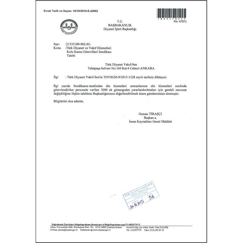İlgi: Türk Diyanet Vakıf-Sen‘in TDVSGM-9/2015-1328 sayılı tarihsiz dilekçesi.
