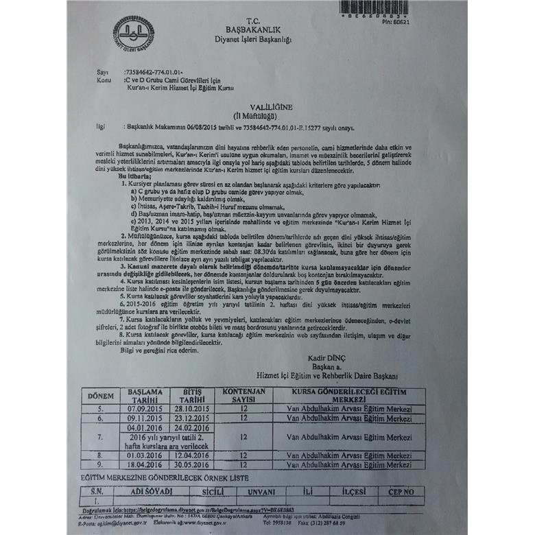 Bu düzenleme ile söz konusu kursların yapılacağı dönem, başlama tarihi, katılacak personel sayısı ve eğitim merkezlerine dair yazılı talimatları 10.08.2015 tarihinde illere gönderilmiştir.