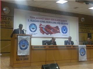 TÜRK DİYANET VAKIF-SEN Elâzığ Şubesi 1. Olağan Genel Kurul toplantısını 23.11 2013 tarihinde Müftülük Sitesi Edibe Can Konferans Salonunda yapıldı. Genel Kurula delegeler ile Elazığ`daki üyelerin tamamına yakını katıldı. Kamu-Sen İl Başkanımız ve Kamu-Sen`e bağlı sendikaların Şube Başkanları, Bitlis İl Başkanı katılarak birer selamlama konuşması yaptılar. Toplantıdan sonra tüm katılımcılara öğlen yemeği verildi. Genel kurula tek listeyle gidilerek, Başkan Bilal DAL güven tazeledi.