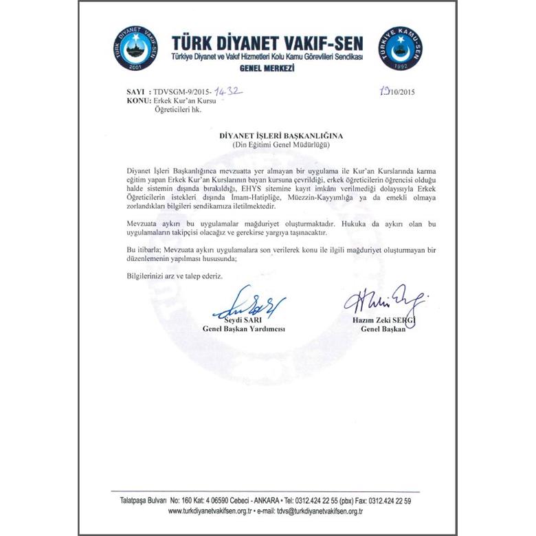 Diyanet İşleri Başkanlığınca mevzuatta yer almayan bir uygulama ile Kur’an Kurslarında karma eğitim yapan Erkek Kur’an Kurslarının bayan kursuna çevrildiği, erkek öğreticilerin öğrencisi olduğu halde sistemin dışında bırakıldığı, EHYS sitemine kayıt imkânı verilmediği dolayısıyla Erkek Öğreticilerin istekleri dışında İmam-Hatipliğe, Müezzin-Kayyımlığa ya da emekli olmaya zorlandıkları bilgileri sendikamıza iletilmektedir.