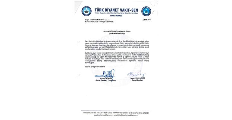 DİYANET İŞLERİ BAŞKANLIĞINA YOLLUK VE YEVMİYE HAKKINDA YAZDIĞIMIZ YAZI: