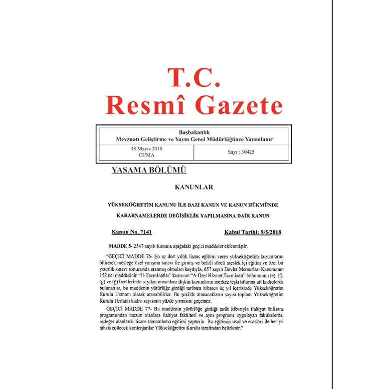İlahiyat önlisans programlarından mezun olanların İlahiyat Fakültesi ve aynı programı uygulayan fakültelerde, eşdeğer alanlarda lisans tamamlama eğitimi yapabilmesine ilişkin Kanun 18.05.2018 tarih ve 30425 sayılı Resmi Gazete’ de yayımlanarak yürürlüğe girdi.