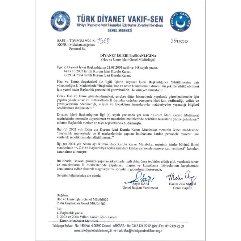 Gerek Hac ve Umre görevlendirmeleri, gerekse diğer hizmetlerde yapılacak görevlendirmeler için yapılan yazılı sınav ve mülakatlarda İl dışından çağrılan personele idari izin verilmediği, yolluk ve yevmiyelerinin ödenmediği, ulaşım ve konaklama hususlarında mağduriyetler yaşandığı bilgileri sendikamıza iletilmektedir.