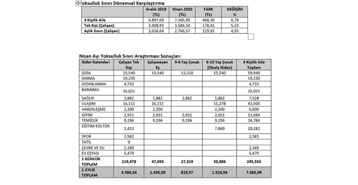 Araştırmada 4 kişilik bir ailenin vaz geçemeyeceği aylık zorunlu harcamalarının Ocak-Nisan arasındaki 4 ayda 468,3 TL zamlandığı ortaya çıktı. Dört aylık dönemde özellikle gıda ve sağlık harcamalarındaki artış dikkati çekti. Bu dönemde mutfak masrafları ortalama %11,32, sağlık harcamaları ise %8,6 zamlandı.