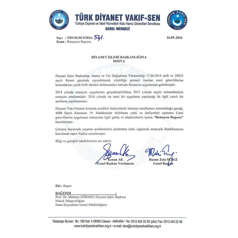 Kamu Görevlileri Sendikasının 16/05/2016 tarihli ve TDVSGM.9/2016-541 sayılı